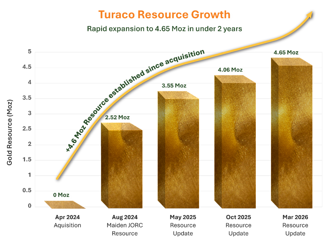 Turaco Gold Limited announced a continued rapid increase in the independent JORC Mineral Resource Estimate (‘MRE’) for the Afema Gold Project, now standing at 115.3Mt at 1.3g/t gold for 4.65Moz, as reported on 18 March 2026.